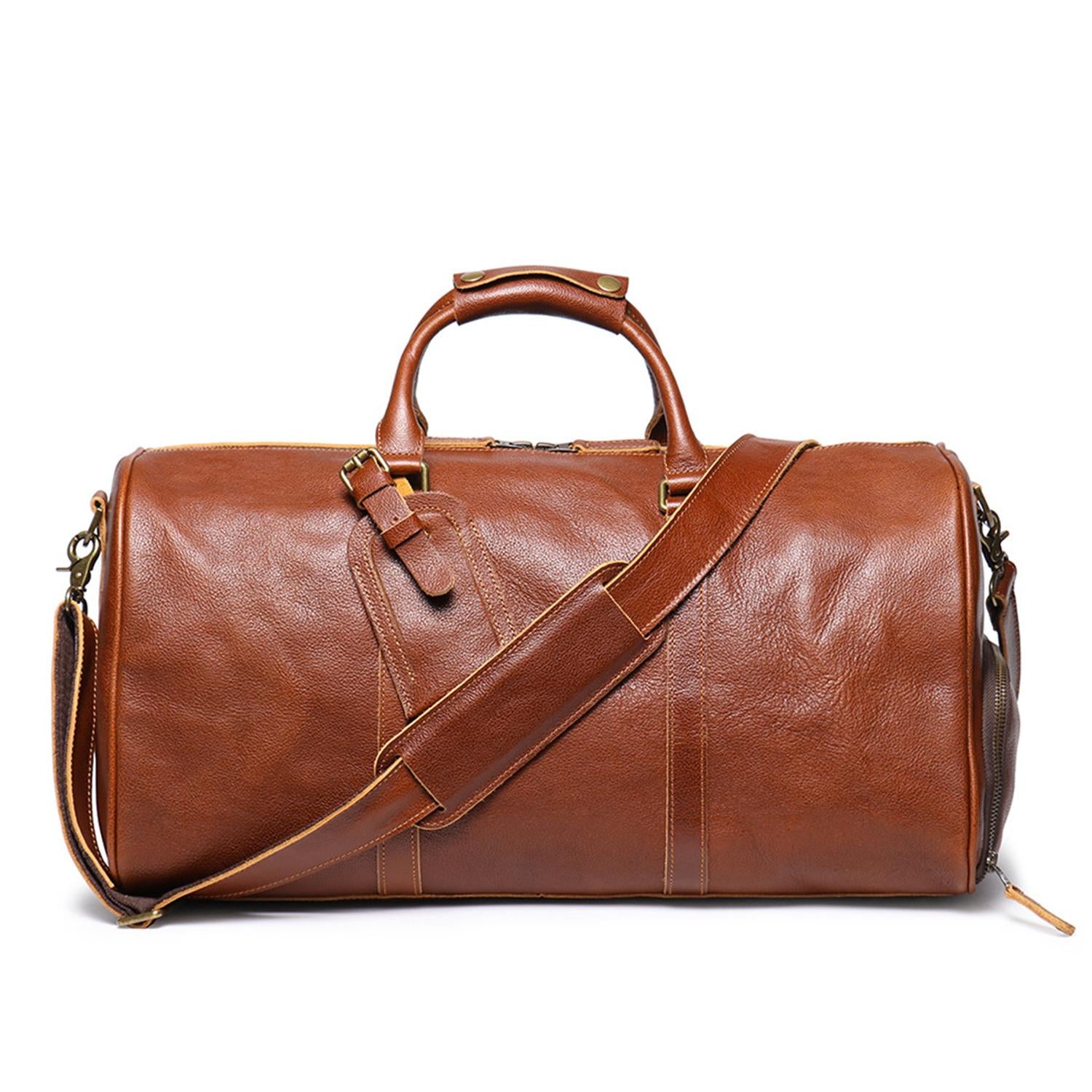 ボストンバッグ メンズ 本革 レトロ 大きめ 大容量 横型 カジュアル シューズ入れ付き 機内持ち込み 荷札 pc収納 2way ストラップ付き 肩掛け 無地 ファスナー 仕切り 底鋲 ダークチョコ MBZB-014