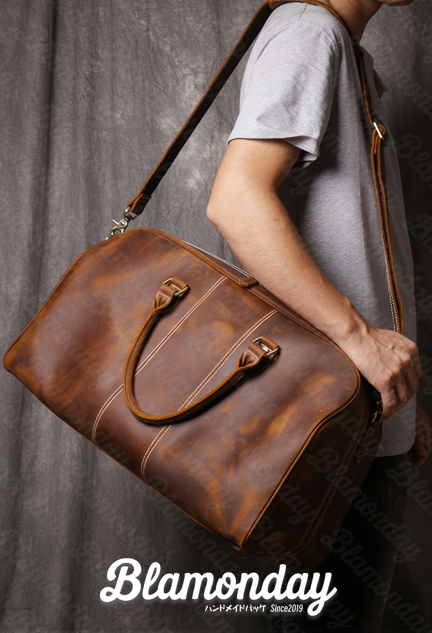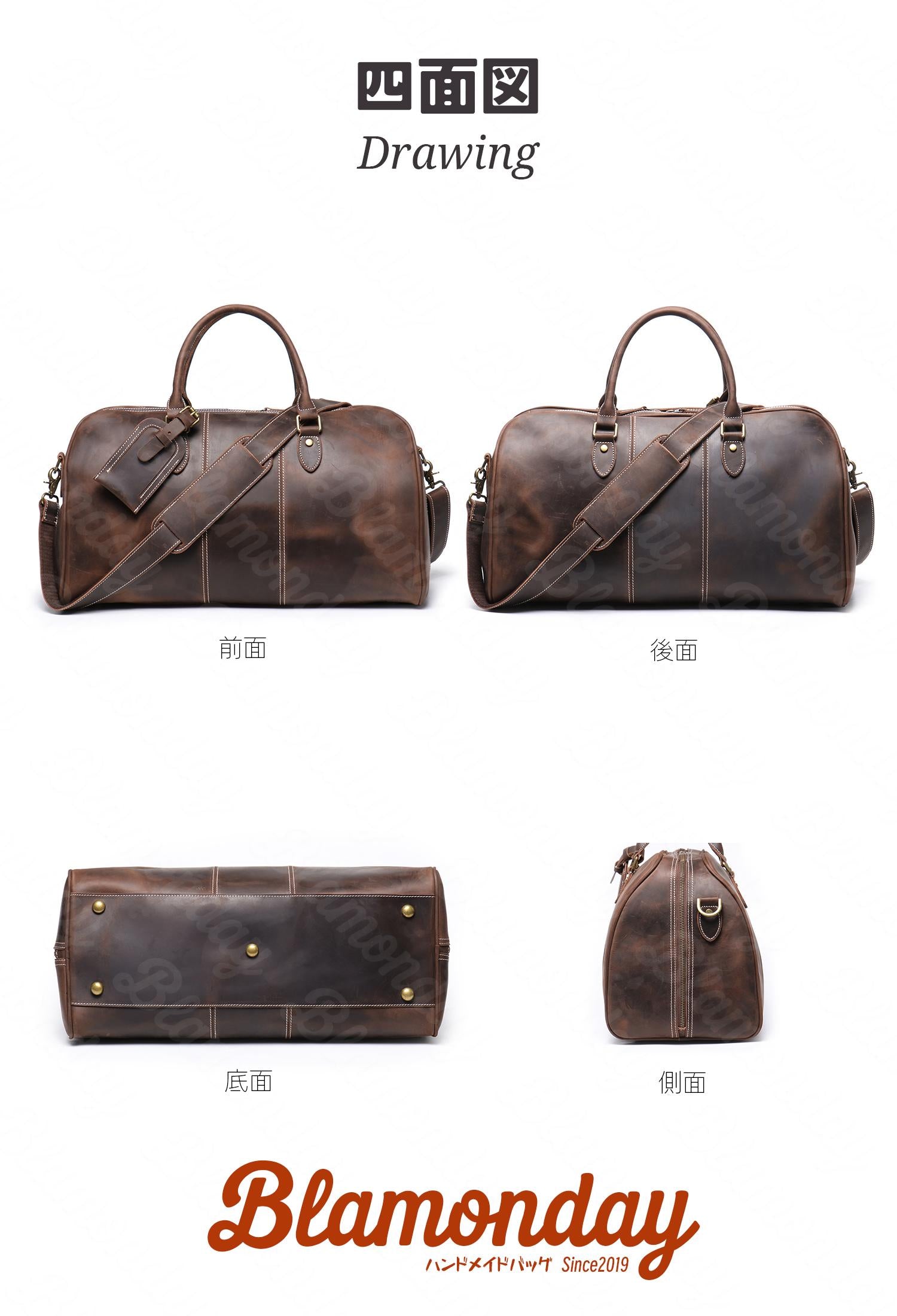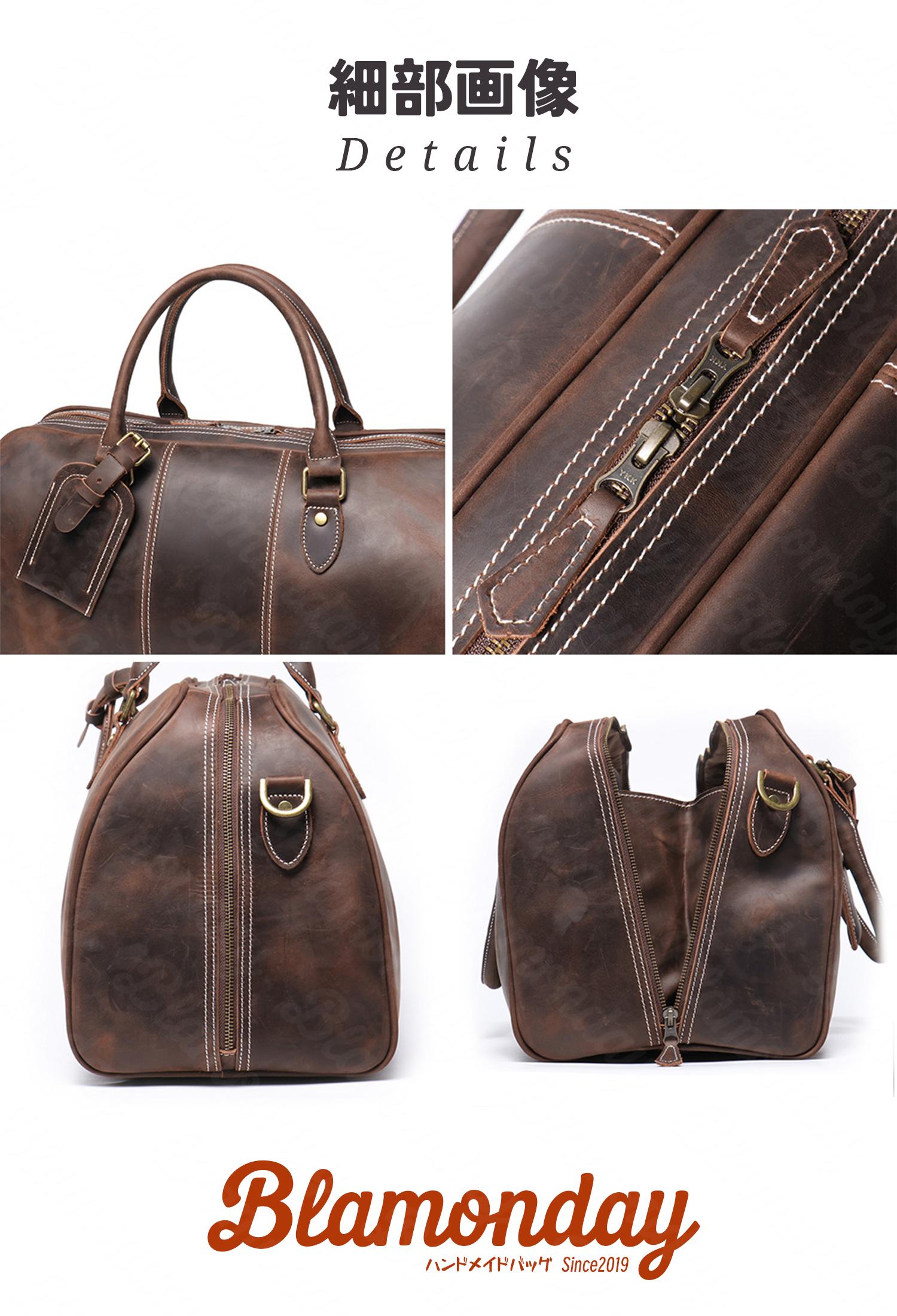 ボストンバッグ メンズ 本革 レトロ 大きめ 大容量 横型 カジュアル 機内持ち込み 荷札 pc収納 2way ストラップ付き 肩掛け 無地 ファスナー 底鋲 ダークチョコ MBZB-028