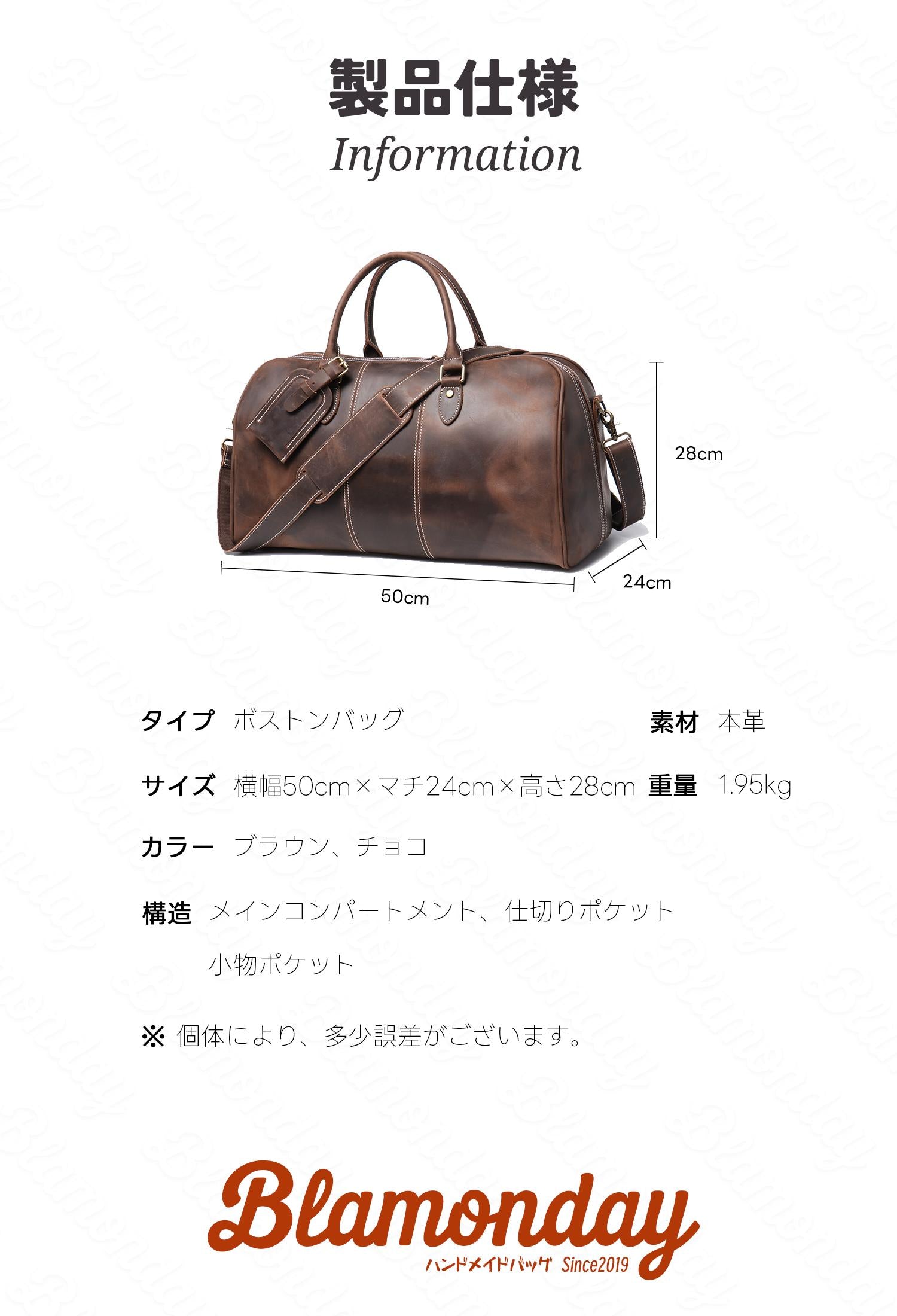 【ボストンバッグ仕様】サイズ:横幅50cm×マチ24cm×高さ28cm。重さ:1.95kg。「機内持ち込み可能なサイズ」機内持ち込みが可能なサイズです。航空会社の規定に合わせたコンパクトなデザインでありながら、十分な容量を確保しています。大型バッグなのに手荷物として持ち込めるので、旅行の便利さをさらに高めます。